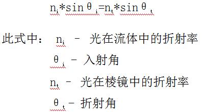用透射光折射法即由測量棱鏡與流體的折射角計算測定溶液的折射率n。光束通過溶液傳播,并在棱鏡的界面折射,折射角由探測器測量。根據(jù)斯涅爾的折射定律可從折射角計算待測液體的折射率n: